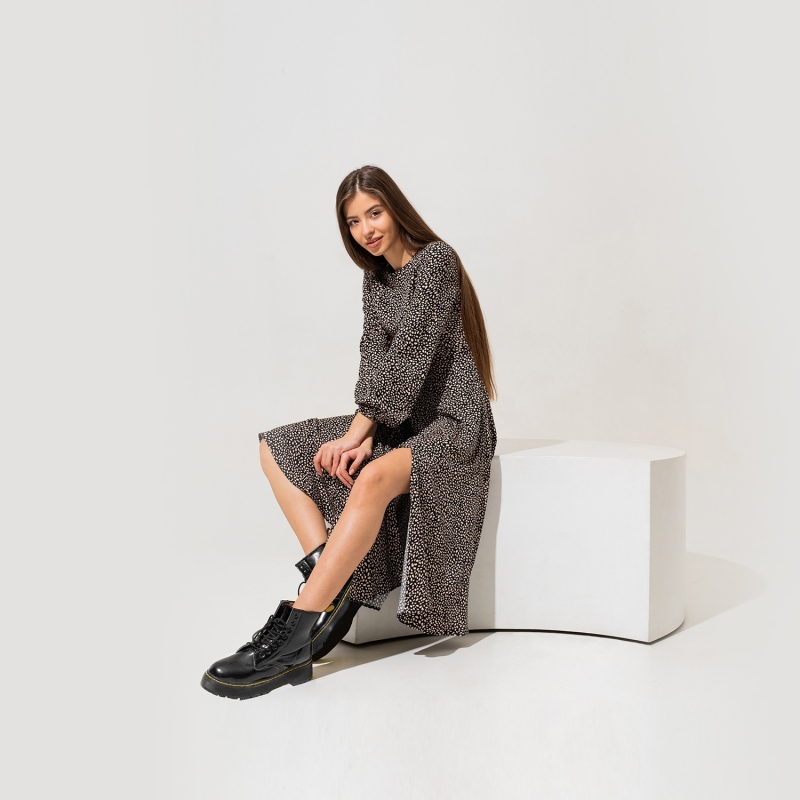 فستان أسود مع طبعات بيضاء منقطة ، له رقبة مستديرة ،