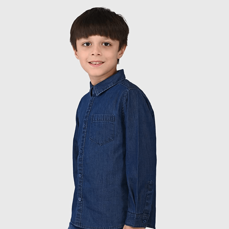 جونيور بويز 100٪ قطن أزرق داكن سادة العادية تناسب الأكمام الكاملة قميص دنيم