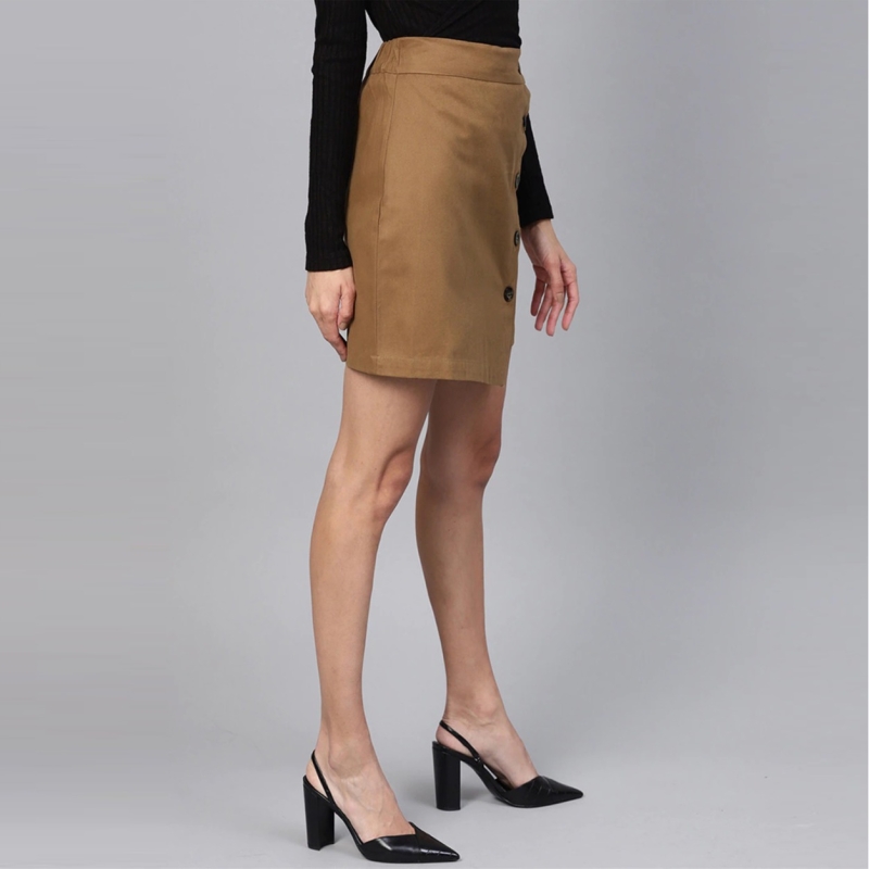 • Brown solid straight skirt, has a partially elasticated waistabnd, button closures, stylised asymmetric hem