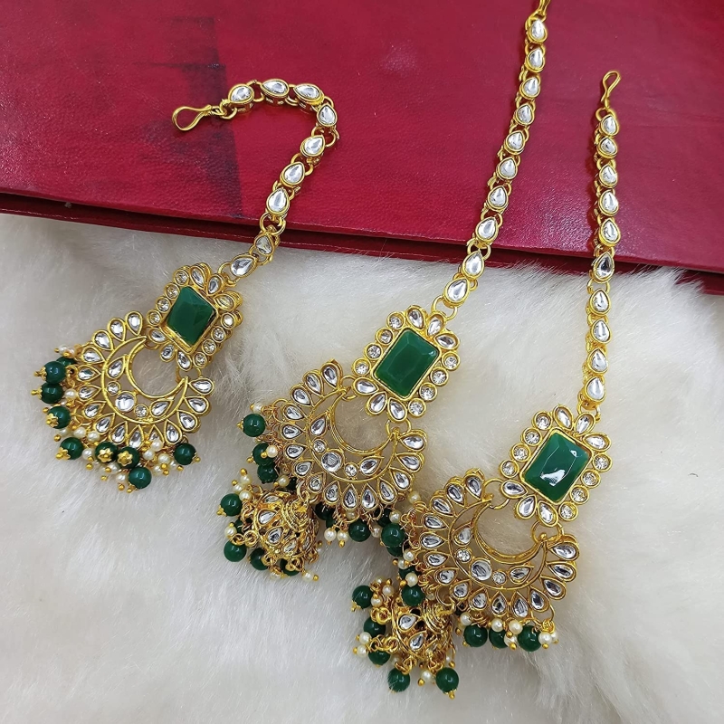 • Womens Gold Plated Alloy Jewellery Set - Green; Contains : 1 Necklace + 1 Pair of Earring + 1 Maang Tikka