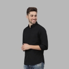 Black solid casual shirt, has a spread collar, button placket, and curved hem