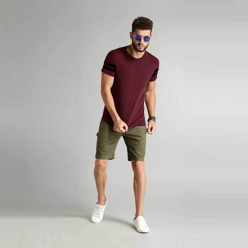 • Maroon solid T-shirt, has a round neck, short sleeves.