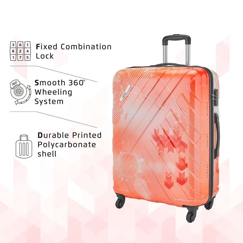 • FEATURES : Number of Wheels - 4, Number Lock, No of Compartments -2, Adjustable Trolley, Hard Case Printed Design Trolley
