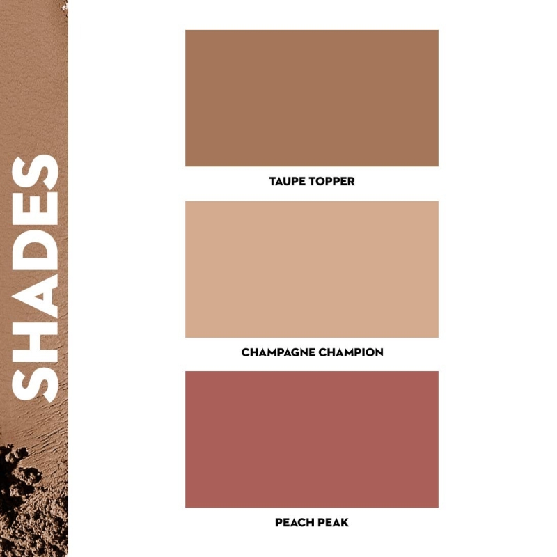 (L to R): Taupe Topper (Cool-toned Brown Bronzer), Champagne Champion (Champagne Gold Highlighter), and Peach Peak (Soft Peach Pink Blush)